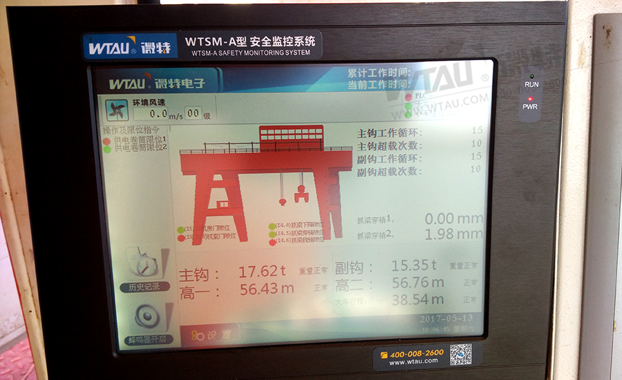 微特安全監(jiān)控系統(tǒng),對門機運行工況進行實時采集,實時記錄。進行數(shù)據(jù)核算比對,顯示畫面比傳統(tǒng)儀表更直觀、更友好。在門機運行接近限定值、規(guī)定值,系統(tǒng)將對司機做出提醒,在到達限定值時將警告司機,并停止司機的危險操作。