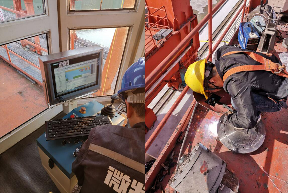 施工過程中,由于尾水門機抓梁不能落到地上,安裝過程中全程都是高空作業(yè),這無疑也加大了施工難度。而且,安裝期內(nèi)恰逢當?shù)囟嘤晏鞖猓瑸榱瞬谎诱`工期,售后工程師們時常要冒雨施工。雖然過程中困難較多,但均被一一克服解決,項目有序推進。
