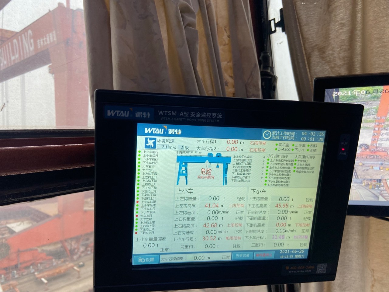 此次微特與泰州三福船舶公司合作項(xiàng)目為WTSM-A型龍門吊安全監(jiān)控管理系統(tǒng),采集了司機(jī)室下位機(jī),小車下位機(jī)及監(jiān)視門機(jī)各個動作及運(yùn)行參數(shù),以及重量、小車行程各限位和操作指令狀態(tài)。各狀態(tài)指示燈在顯示紅燈時代表門機(jī)對應(yīng)機(jī)構(gòu)已動作,綠燈代表對應(yīng)機(jī)構(gòu)無動作,各重量行程及速度會在屏上顯示出對應(yīng)的數(shù)據(jù)。