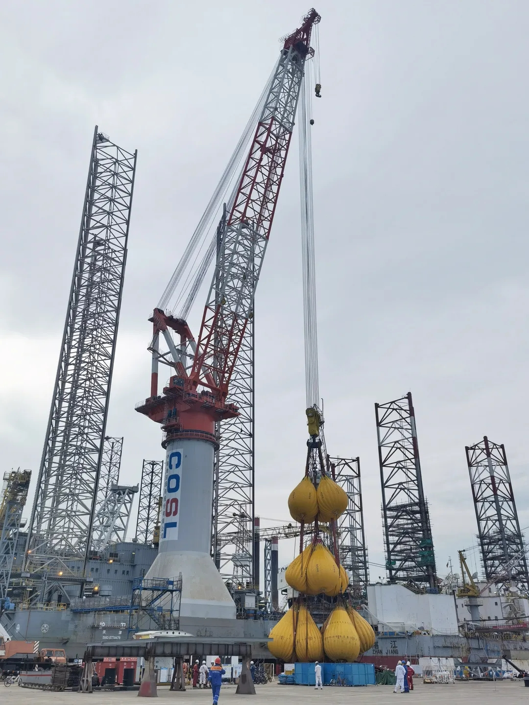 裝備自重840T,吊臂長達(dá)76米,定點吊最大安全工作負(fù)荷800T,全回轉(zhuǎn)吊最大安全工作負(fù)荷650T。設(shè)備吊臂上配備了一個800T主鉤,一個120T副鉤,其中主鉤最大起升高度為甲板面上105米,副鉤最大起升高度甲板面以上113米,能滿足風(fēng)電塔筒、扇葉、電機(jī)的安裝需求。