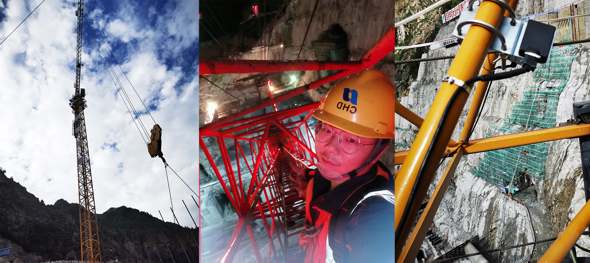 說(shuō)起來(lái)也挺有意思,每次只要花了十幾分鐘帶著工具設(shè)備好不容易爬到了一號(hào)門機(jī)臂桿頂端的檢修平臺(tái),立馬就會(huì)下場(chǎng)雨。最初還會(huì)趕緊往回走,但往往還沒(méi)走下臂桿雨就停了,太陽(yáng)又出來(lái)了。后來(lái)也就不在乎了,下雨了就檢查固定臂桿上的安全帶,靜靜等雨停了再繼續(xù)工作。有時(shí)為了趕工期 也會(huì)持續(xù)加班到深夜,直到固定好了所有設(shè)備,光線完全無(wú)法滿足工作需求了才回去。