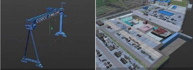 將關(guān)聯(lián)的吊機(jī)模型帶入船塢場地模型中,以船塢空間為統(tǒng)一坐標(biāo)系,軌道方向?yàn)閄軸,在船塢空間數(shù)學(xué)模型中真實(shí)的反應(yīng)各吊機(jī)的位置、臂架方位、吊鉤高度等關(guān)鍵信息。
