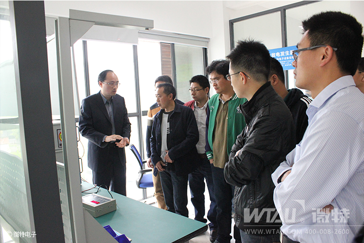 在實驗室微特電子高總向來訪貴賓介紹雷擊浪涌實驗設備