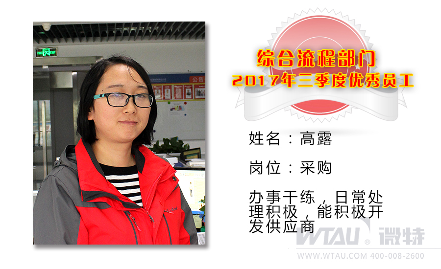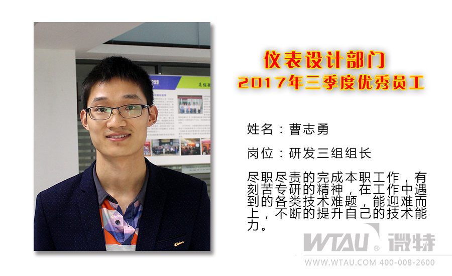 三季度先進提名:生產(chǎn)部:楊開翔;儀表設(shè)計部:蔡小雨;聲波&市場營銷:倪秀;綜合流程部:劉滿君、陳曉燕 ;微特智慧谷:萬澤容