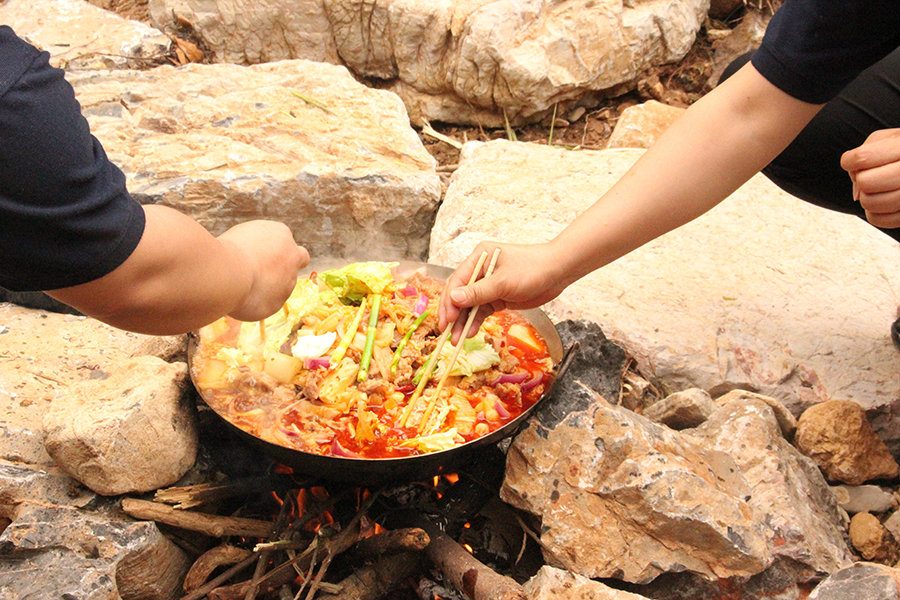 經(jīng)過半天的登山式行軍,中午,我們來到山谷中一處較平坦地地方,各隊開始分工埋鍋造飯,相互配合做中餐。