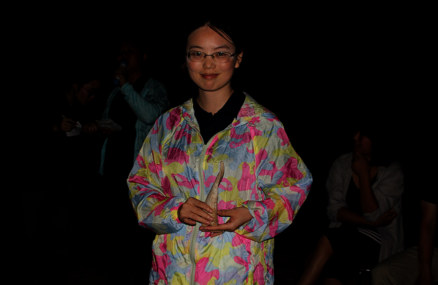 晚會最后,各隊拿出各自行軍過程中尋得的寶物,在這里微特公司首次愛心拍賣會溫情上演。(上圖為Supreme隊持寶人正在講解她所持的盆栽寶貝,左右兩邊的隊員正在為寶貝打燈光)