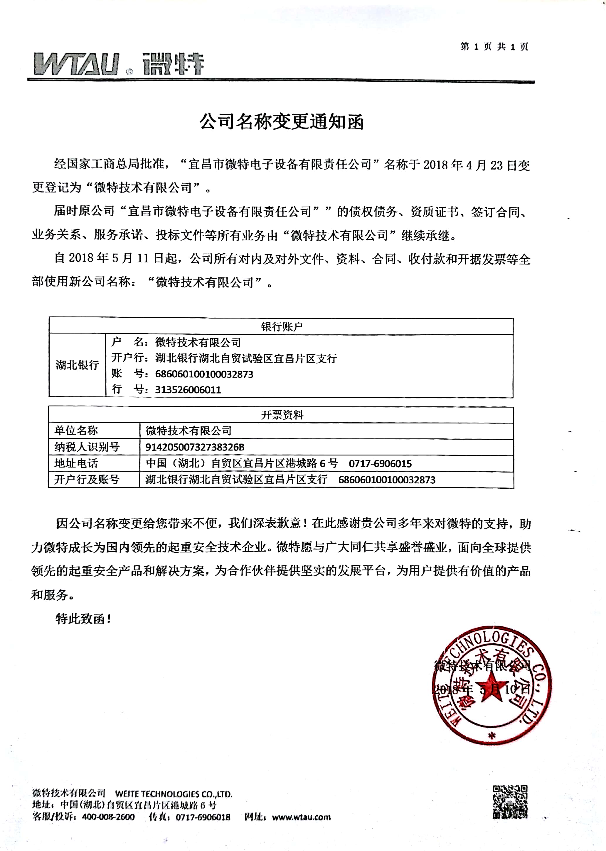 注:自2018年5月11日起,原公司“宜昌市微特電子設(shè)備有限責(zé)任公司””的債權(quán)債務(wù)、資質(zhì)證書、簽訂合同、業(yè)務(wù)關(guān)系、服務(wù)承諾、投標(biāo)文件等所有業(yè)務(wù)由“微特技術(shù)有限公司”繼續(xù)承繼。公司所有對內(nèi)及對外文件、資料、合同、收付款和開據(jù)發(fā)票等全部使用新公司名稱:“微特技術(shù)有限公司”。