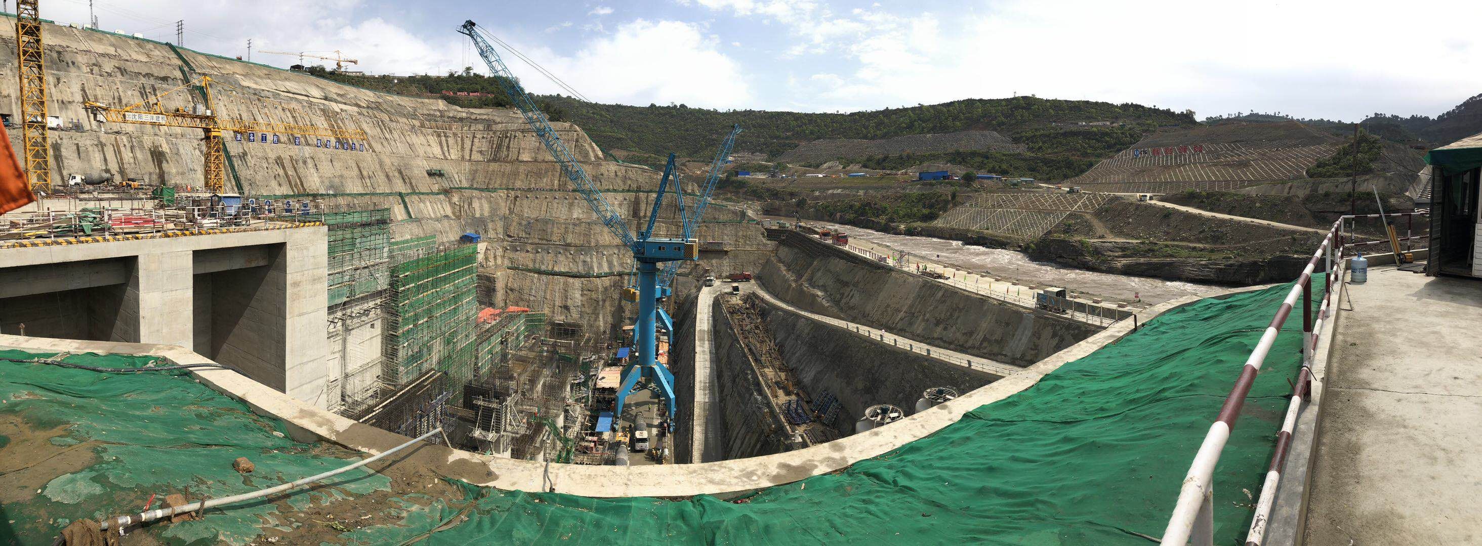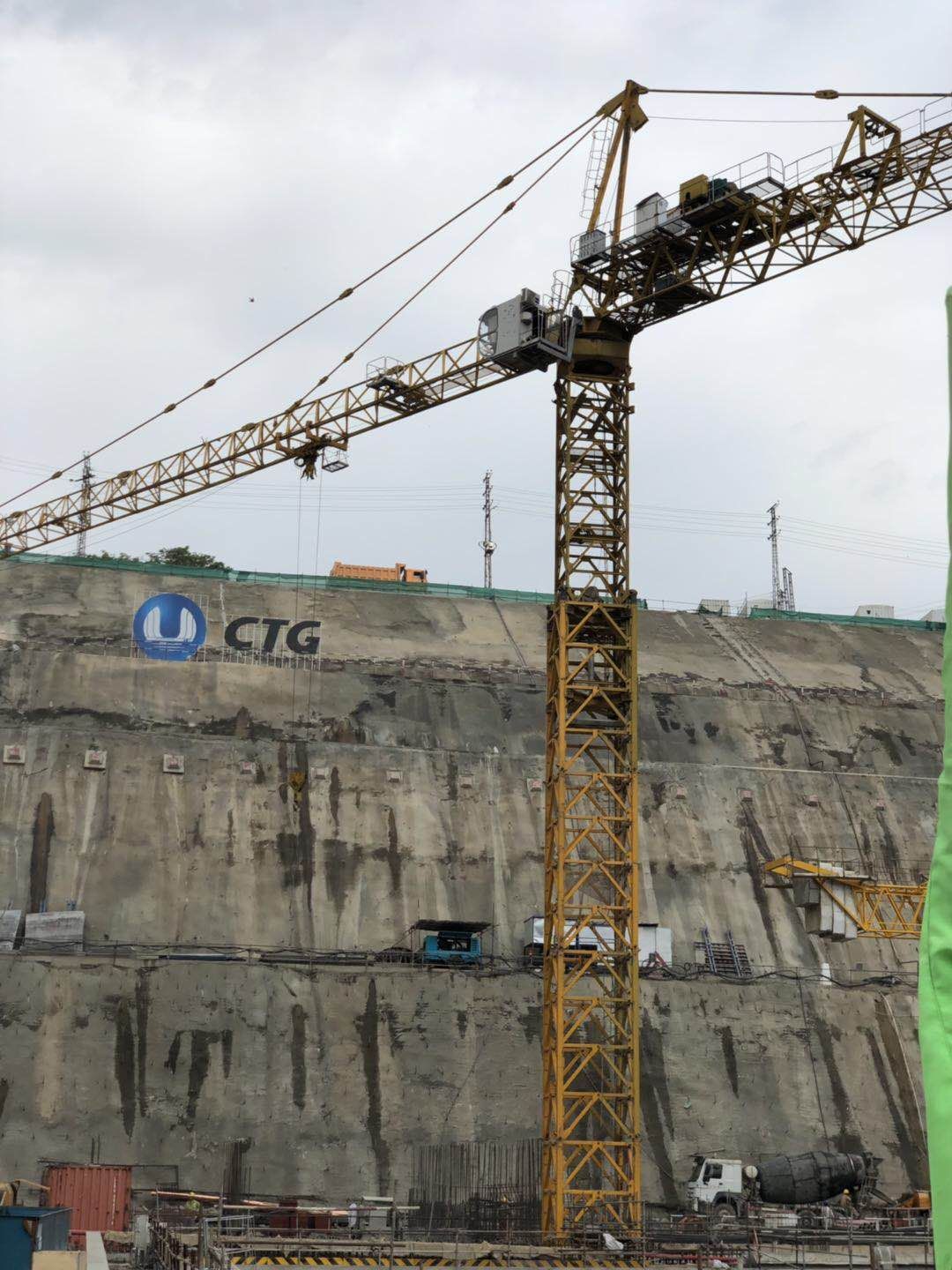 ▲卡洛特水電站現(xiàn)場(chǎng)施工塔機(jī)及門座式起重機(jī)
