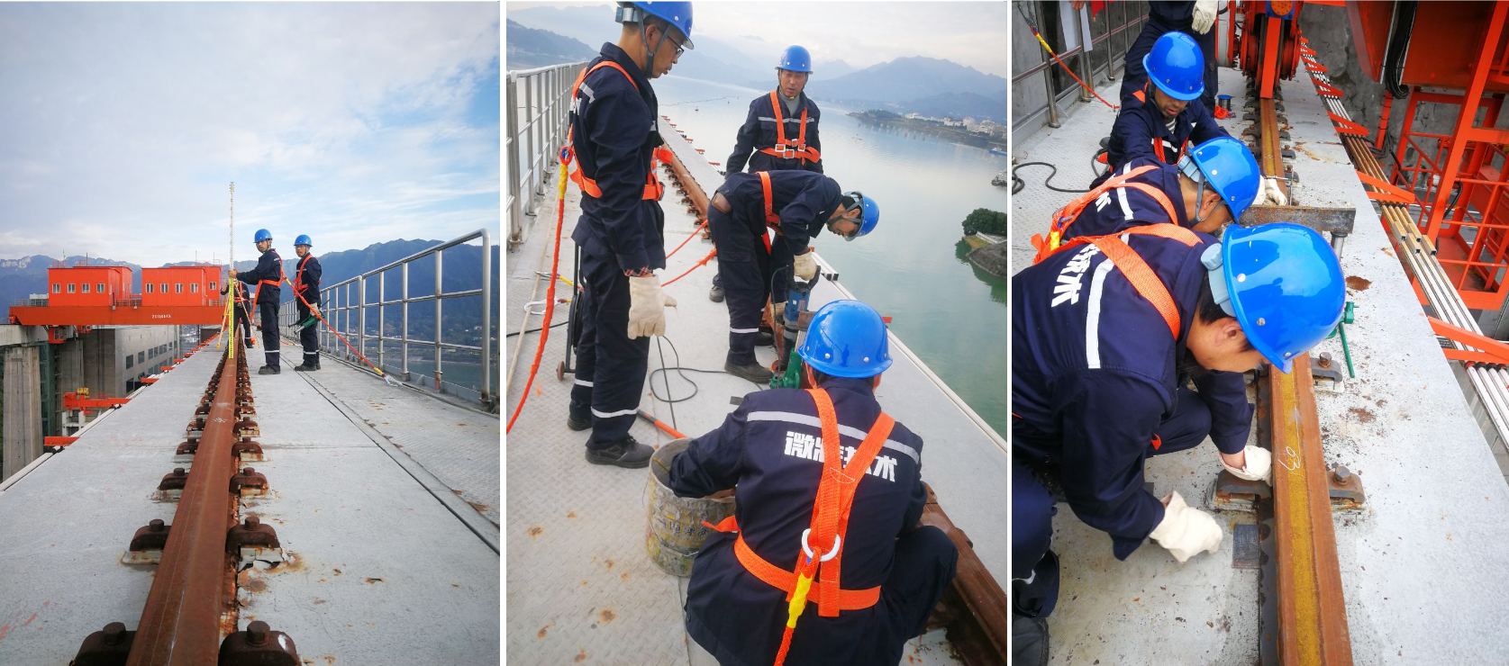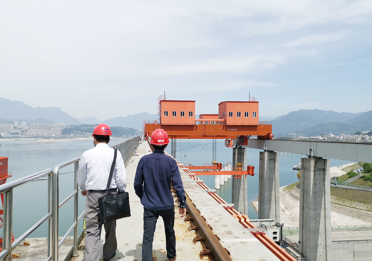 ▲微特技術(shù)人員配合三峽通航管局領(lǐng)導(dǎo)檢查現(xiàn)場施工情況