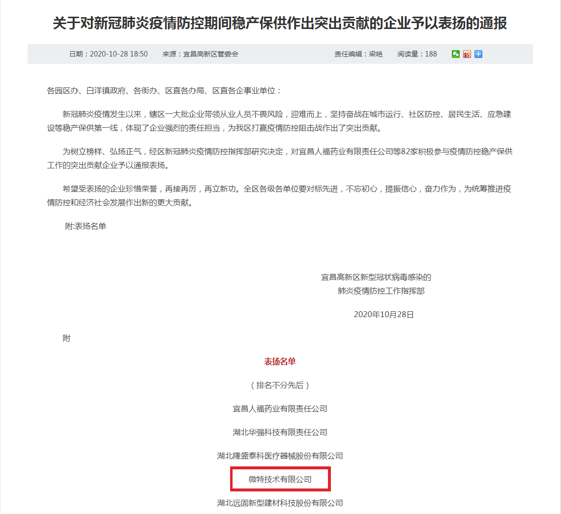 近期,宜昌高新區(qū)新型冠狀病毒感染的肺炎疫情防控工作指揮部發(fā)布了《關(guān)于對新冠肺炎疫情防控期間穩(wěn)產(chǎn)保供作出突出貢獻(xiàn)的企業(yè)予以表揚(yáng)的通報》,微特技術(shù)有限公司位列表揚(yáng)名單。