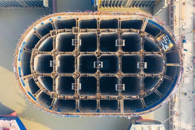 5號、6號墩鋼沉井每個用鋼量達(dá)1.8萬噸,沉井底面長95米,寬57.8米,總高72米,為世界在建最大水上沉井基礎(chǔ) 。
