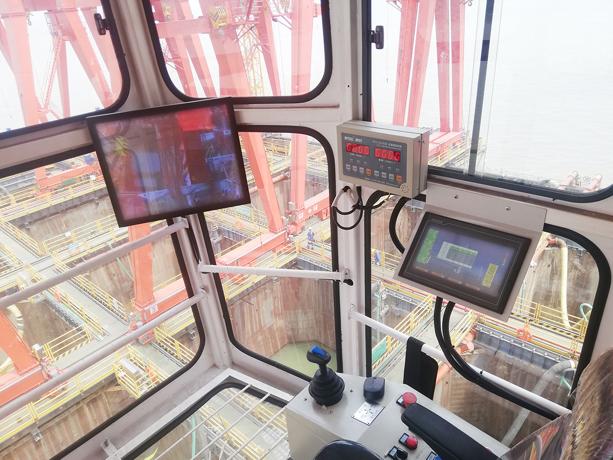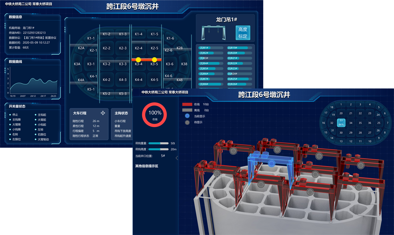 微特今年下半年與項目部多次溝通,與總工反復(fù)進行技術(shù)協(xié)商及推演,最終決定使用龍門吊來監(jiān)測泥面高度,通過三維定位龍門吊的方案,找到每個龍門吊在沉井上的坐標(biāo),再結(jié)合卷揚機的高度變化,來實現(xiàn)每日單天每個井孔的最大深度測量,達(dá)到自動測量自動生產(chǎn)數(shù)據(jù)報表功能,使得沉井下沉高度自動可視可測。