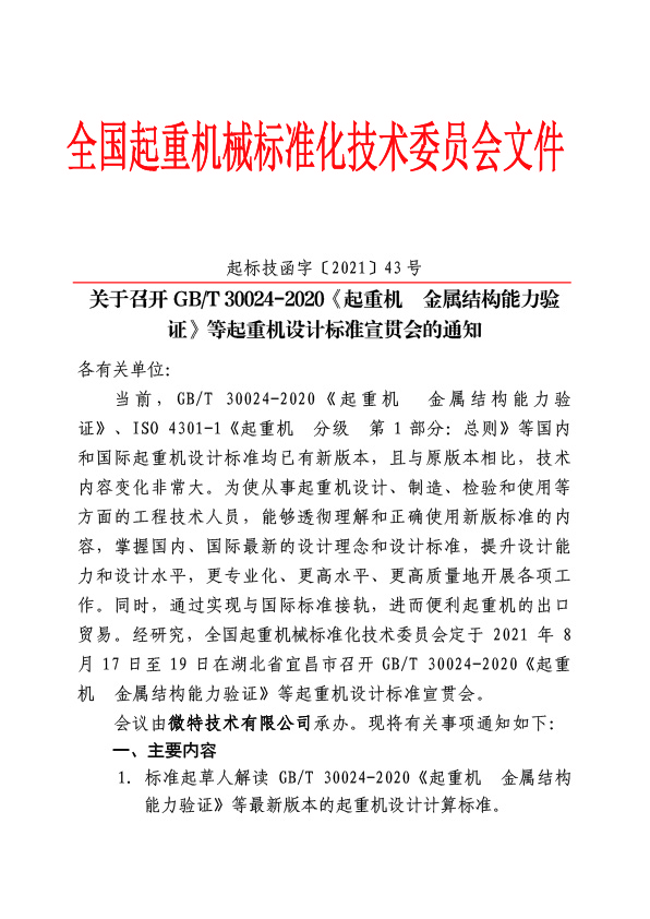 為使從事起重機設計、制造、檢驗和使用等方面的工程技術(shù)人員,能夠透徹理解和正確使用新版標準的內(nèi)容,掌握國內(nèi)、國際最新的設計理念和設計標準,提升設計能力和設計水平,更專業(yè)化、更高水平、更高質(zhì)量地開展各項工作,全國起重機械標準化技術(shù)委員會針對起重機分級、剛性、金屬結(jié)構(gòu)能力驗證等方面的設計計算標準,將于2021年8月18日至19日湖北宜昌召開標準宣貫會。