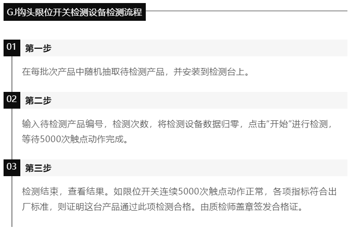 微特GJ鉤頭限位開關(guān)是用于起重機(jī)械鋼絲繩防過卷限位的一種電器自動(dòng)保護(hù)開關(guān)。它與適當(dāng)重量的重錘配套,利用吊鉤的上下運(yùn)動(dòng)托起或放下重錘時(shí)斷開或通導(dǎo)開關(guān),達(dá)到限制鋼絲繩過卷和吊鉤在一定高度內(nèi)升降的目的。 微特,專心做起重機(jī)安全領(lǐng)域的waitor,將品質(zhì)控制貫穿服務(wù)全流程,為保障GJ鉤頭限位開關(guān)的品質(zhì)合格,針對(duì)性研發(fā)了GJ鉤頭限位開關(guān)檢測設(shè)備。 ![]() 在GJ鉤頭限位開關(guān)出廠前,由資深質(zhì)檢員對(duì)限位開關(guān)進(jìn)行連續(xù)5000次觸點(diǎn)動(dòng)作的品質(zhì)檢測。 ![]() ![]() ![]() |