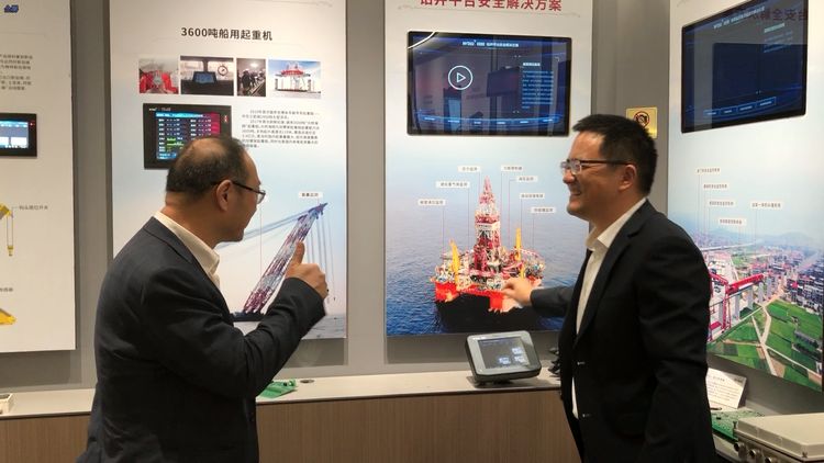 (在微特產品演示廳,聶道靜向金教授介紹行業(yè)應用產品)