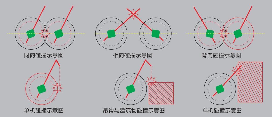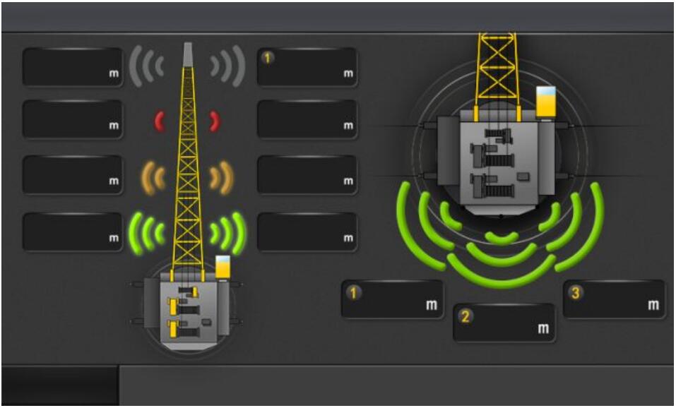 區(qū)域主動(dòng)防碰撞系統(tǒng): 通過雷達(dá)主動(dòng)監(jiān)測(cè)起重機(jī)易碰運(yùn)動(dòng)部位路徑,探測(cè)區(qū)域空間內(nèi)是否有障礙物,以此來避免吊機(jī)與吊機(jī)間,回轉(zhuǎn)部位與其它物體、臂架與周邊物體之間的區(qū)域空間是否安全,在安全區(qū)被入侵時(shí)發(fā)出聲、光報(bào)警,甚至給出止停控制信號(hào),實(shí)現(xiàn)主動(dòng)防碰撞監(jiān)測(cè)保障設(shè)備安全。