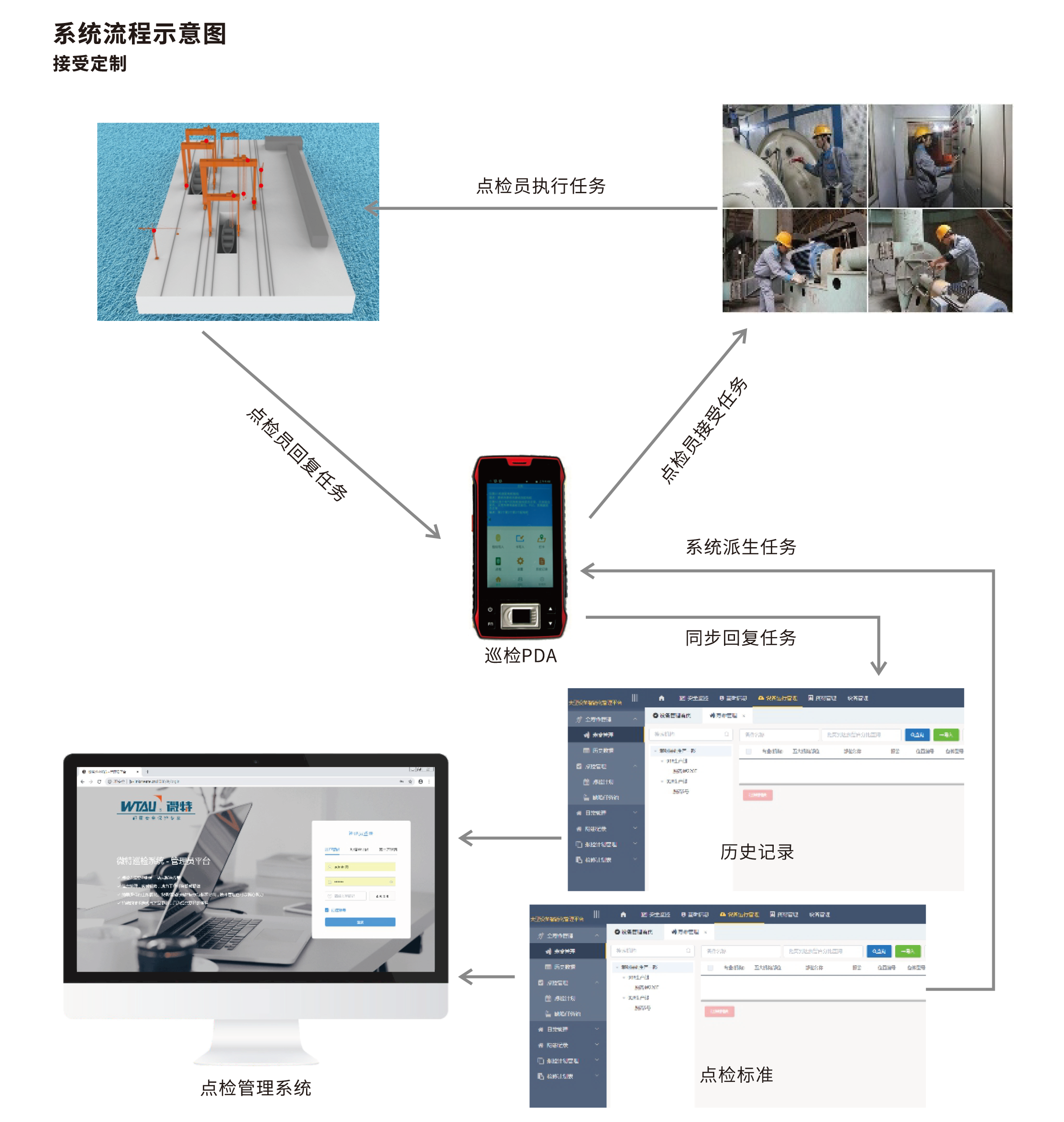 WT-SMS-V2.0設(shè)備點(diǎn)檢系統(tǒng)是結(jié)合船廠起重機(jī)實(shí)際生產(chǎn)點(diǎn)檢標(biāo)準(zhǔn)及管理積累經(jīng)驗(yàn),設(shè)計(jì)生產(chǎn)的一款產(chǎn)品。