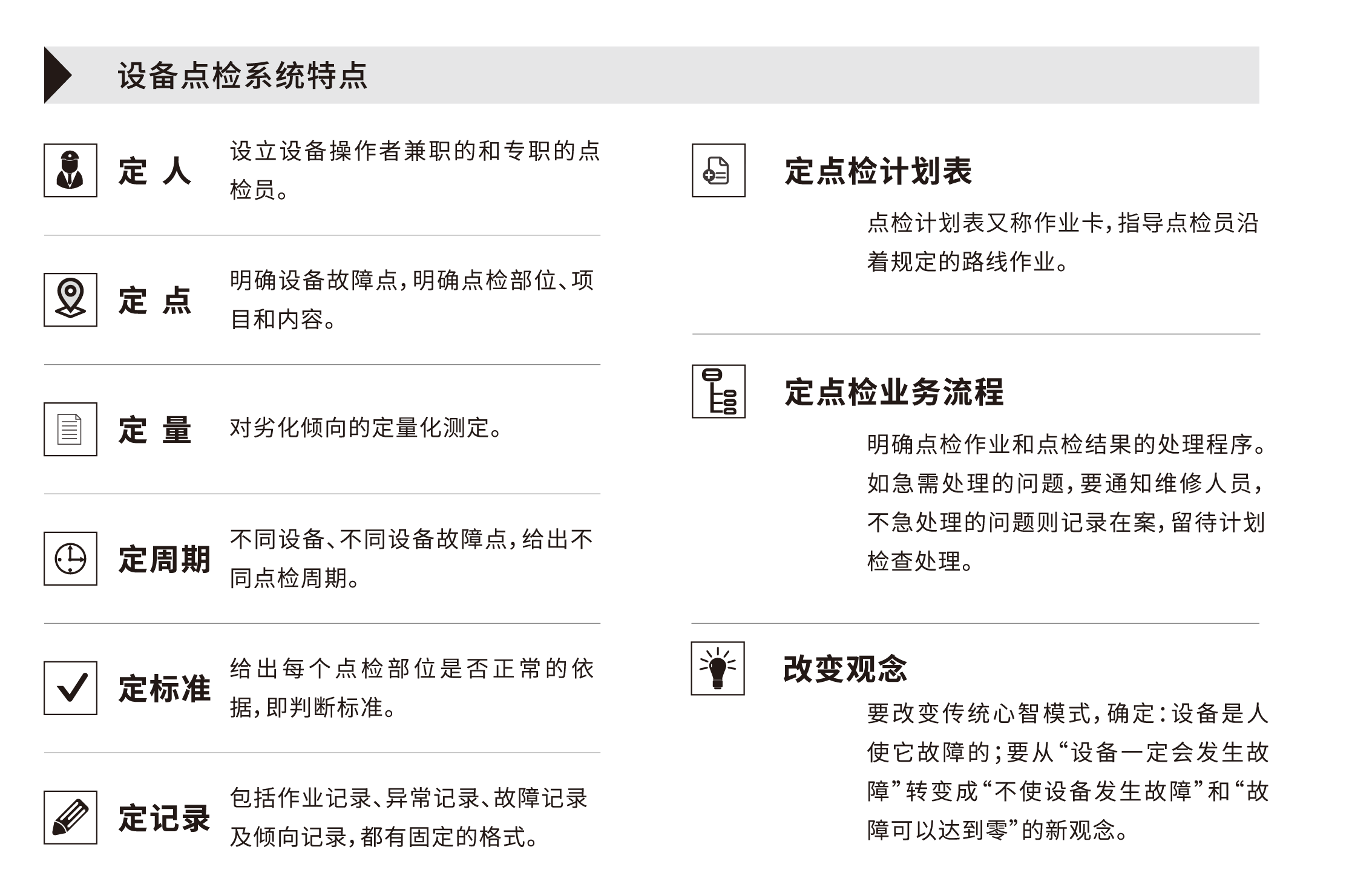 點(diǎn)檢是車(chē)間設(shè)備管理的一項(xiàng)基本制度,目的是通過(guò)點(diǎn)檢準(zhǔn)確掌握設(shè)備技術(shù)狀況,維持和改善設(shè)備工作性能,預(yù)防事 故發(fā)生,減少停機(jī)時(shí)間,延長(zhǎng)設(shè)備壽命,降低維修費(fèi)用,保證正常生產(chǎn)。