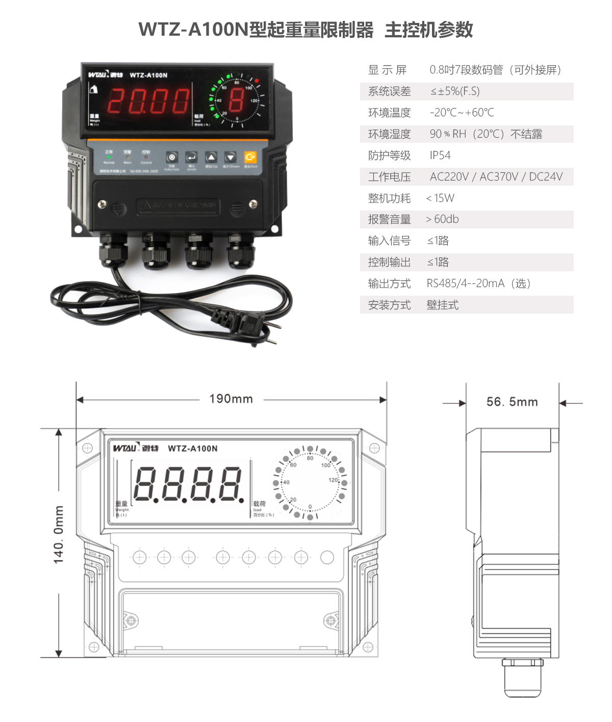 WTZ-A100N起重量限制器采用紅色0.8吋超大7段數碼管,雙窗口顯示,可外接大屏。儀表設計為單片機控制,全按鍵提示符操作。