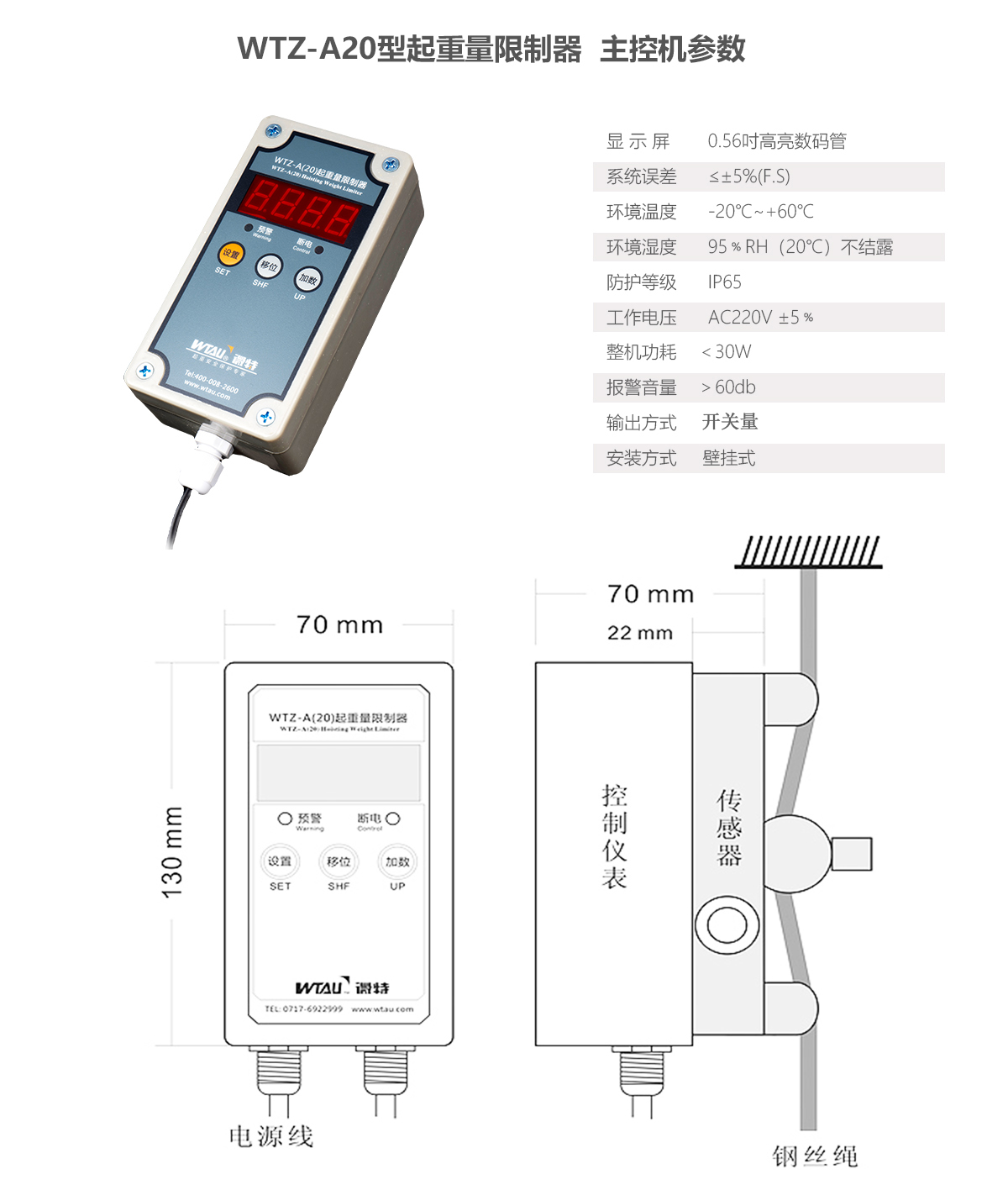 WTZ-A20起重量限制器用于一路重量信號(hào)監(jiān)測(cè),適用于升降機(jī)、電動(dòng)葫蘆等鋼絲繩置吊的起重設(shè)備。
