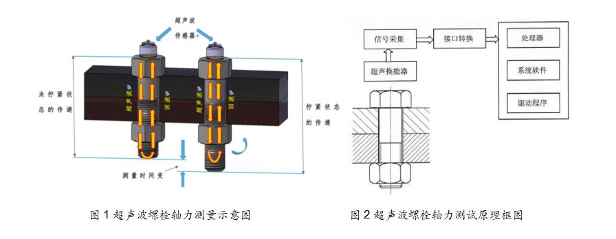 公式中v為機(jī)械縱波在螺栓內(nèi)的傳播速度。圖1為超聲波螺栓軸力測(cè)量示意圖,圖2 超聲波螺栓軸力測(cè)試原理框圖。