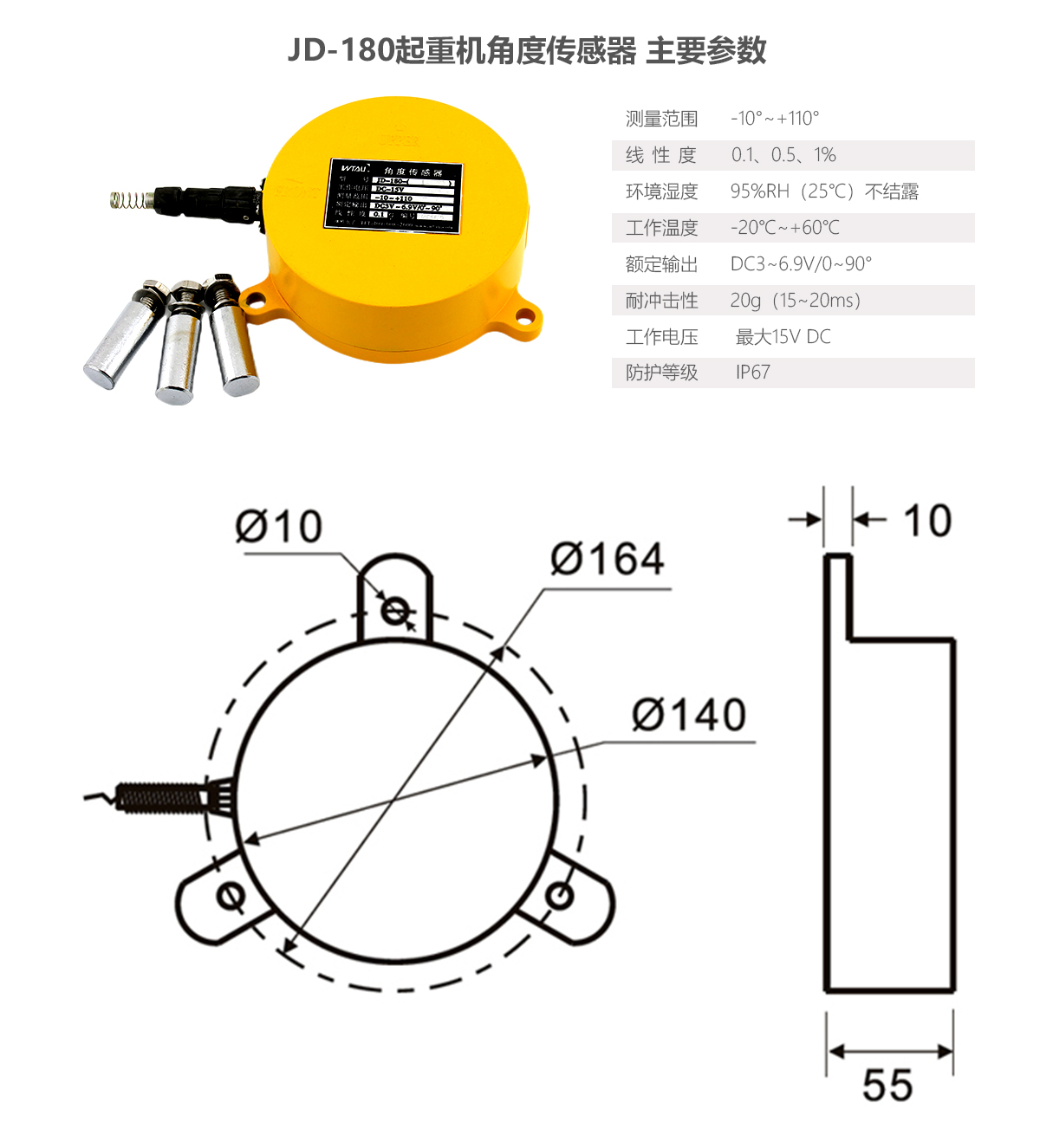 JD-180起重機角度傳感器由電位器和擺錘組成,可裝在起重機的吊桿上,吊桿對地的角度是通過重錘帶動電位器旋轉(zhuǎn)來測定,輸出相應(yīng)的電壓值。