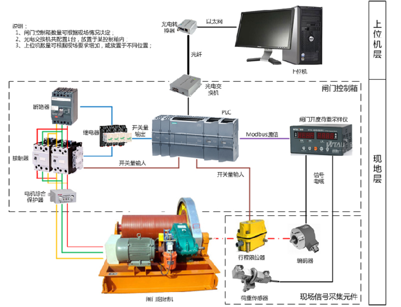 控制系統(tǒng)采用分層分布式結(jié)構(gòu),整個系統(tǒng)分為兩層,上層為中控室監(jiān)控單元、下層為現(xiàn)地操作單元。實(shí)現(xiàn)對所有閘門的監(jiān)視、控制;現(xiàn)地層以PLC為主控元件實(shí)現(xiàn)控制。根據(jù)閘門數(shù)量配置控制箱,每扇閘門各配置1臺控制箱,放置于被控閘門啟閉機(jī)旁。既可在上位機(jī)實(shí)現(xiàn)對閘門的遠(yuǎn)程監(jiān)控,亦可通過控制箱上的按鈕對閘門進(jìn)行現(xiàn)地操作。