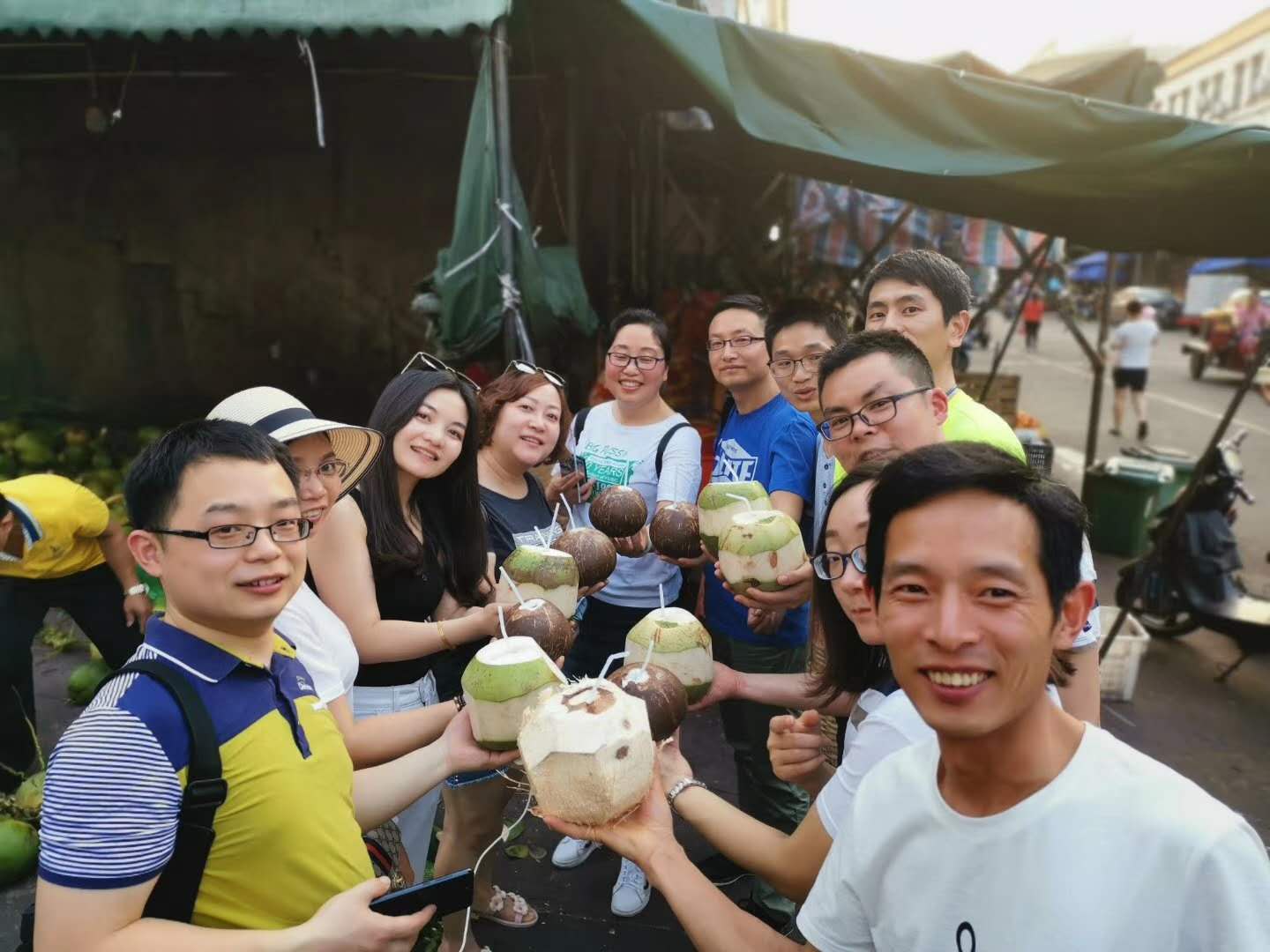 抵達(dá)酒店后,有些迫不及待了。下午我們一行就轉(zhuǎn)了轉(zhuǎn)周邊的集貿(mào)市場(chǎng)還和水果市場(chǎng),來(lái)到椰城肯定少不了的就是一嘗鮮嫩甘甜可口的椰子了,當(dāng)然也學(xué)到如何選好喝的椰子的方法,青椰、紅椰、金椰,紅椰和青椰個(gè)頭差不多大,汁水充足,后者有淡淡的甜味兒,前者則微酸,冰凍過(guò)后更加美味。椰肉吃起來(lái)也是香香脆脆的,不過(guò)只有薄薄一層。挑紅椰的時(shí)候不一定非要挑大個(gè)兒的,小的有很多皮特薄,椰汁不比大的少。