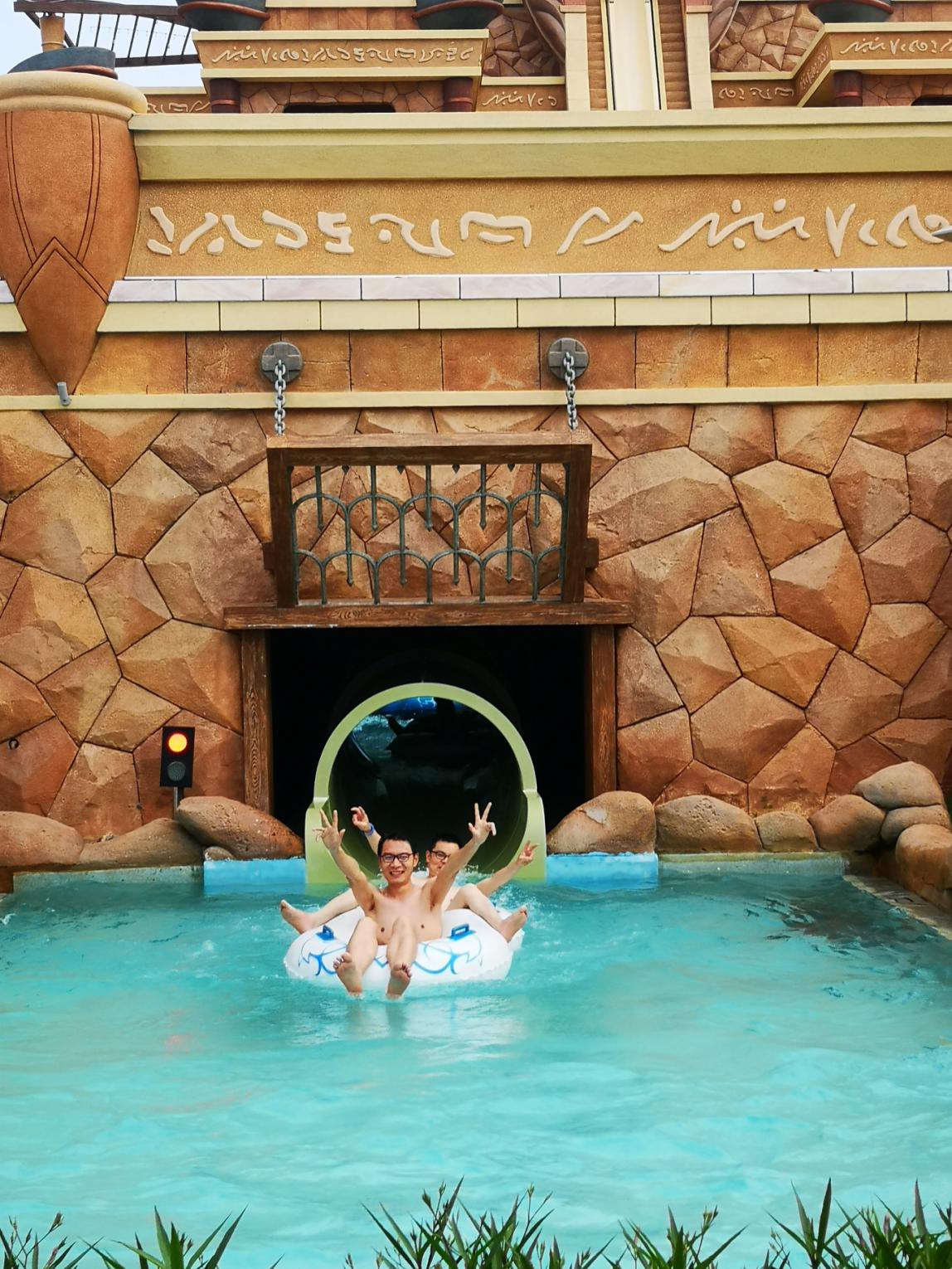 體驗(yàn)了一下“海神之躍”按照安全員的示范做好準(zhǔn)備,雙臂交叉抱緊,雙腿交叉。切記,過(guò)程中不能改變姿勢(shì)。最后,慢慢往下挪,突然整個(gè)人失重,接著大腦一片空白三、四秒后,就已經(jīng)到達(dá)出口了,這幾秒很想知道自己到底經(jīng)歷了什么。立馬從泳池里爬起來(lái)找我們的小伙伴,剛才有拍到嗎,太快了而且距離太遠(yuǎn)根本拍不到。