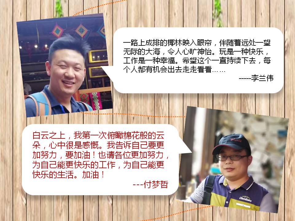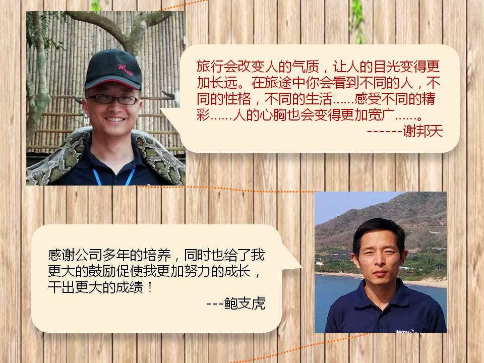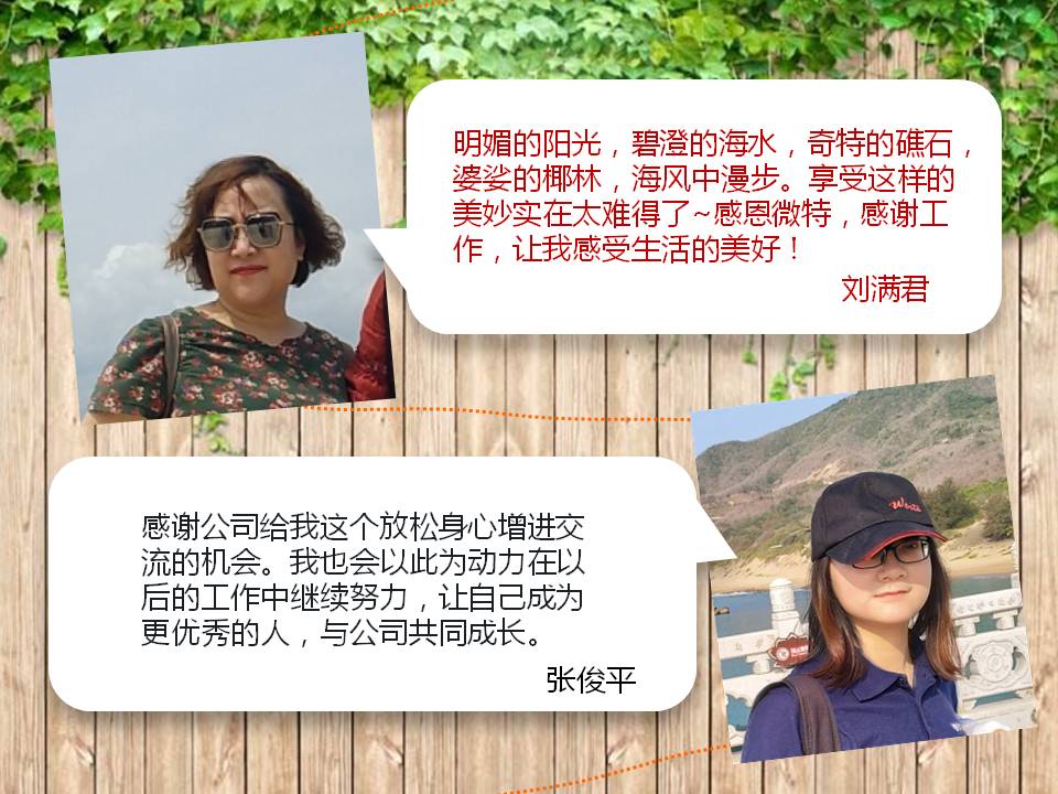 微特為2018年工作表現(xiàn)優(yōu)秀的15名員工給出了特別驚喜的獎(jiǎng)勵(lì)-雙飛6日海南游獎(jiǎng)勵(lì),很有幸也很高興本次被評(píng)為優(yōu)秀員工,非常感謝公司領(lǐng)導(dǎo)的多年的培養(yǎng),同時(shí)也給了我們更大的鼓勵(lì)和激勵(lì),促使我們更加努力更快的成長(zhǎng),干出更大的成就!