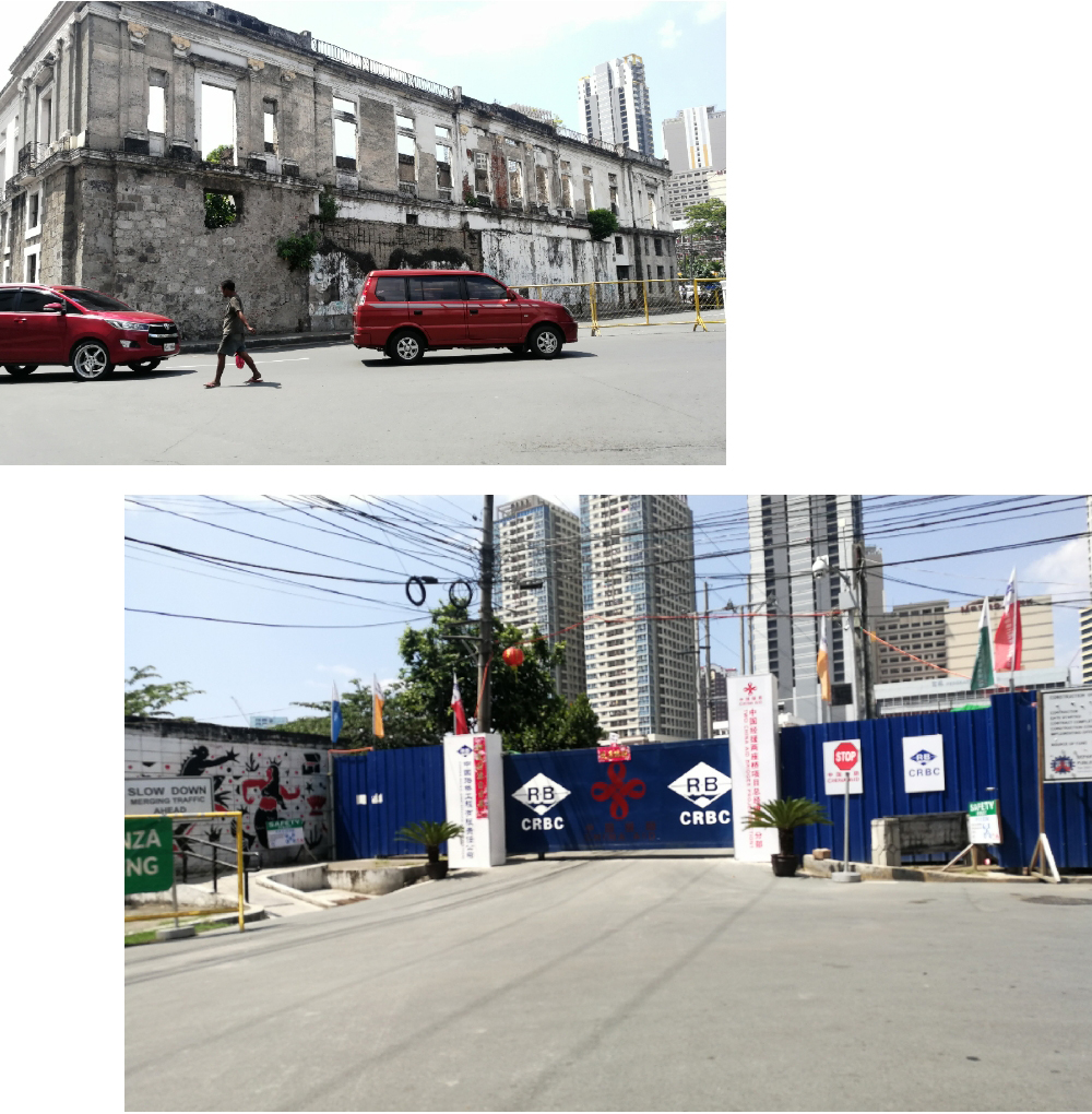 ▲滿目瘡痍的建筑旁邊,有一個(gè)掛著“中國援建”的項(xiàng)目正在施工中